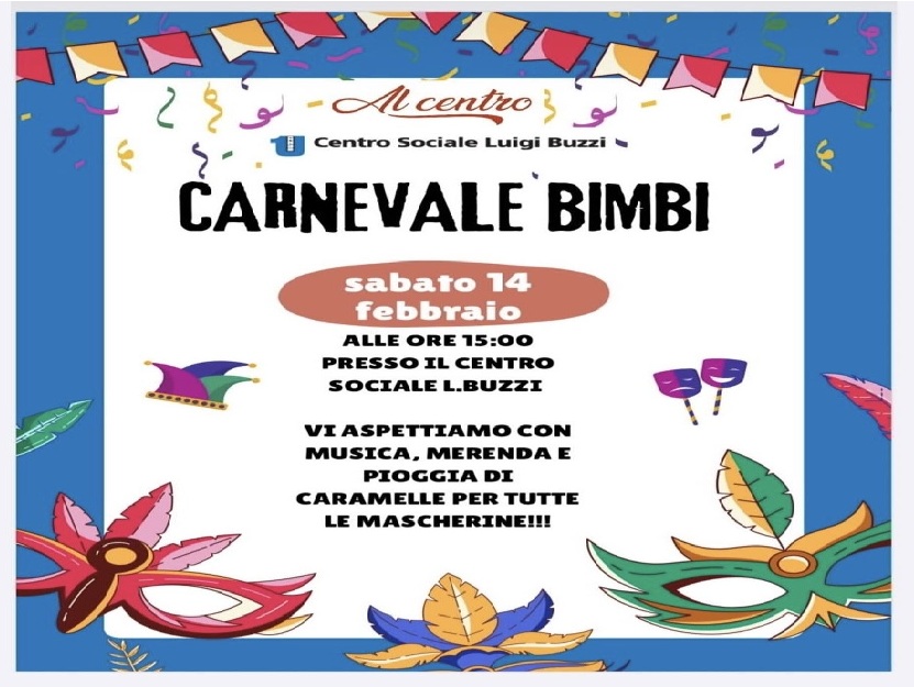 CARNAVALE BIMBI, Sabato 14 alle ore 15:00 preso il Centro Luigi Buzz, vi aspettiamo con musica, merenda e pioggia di caramelle per tutti